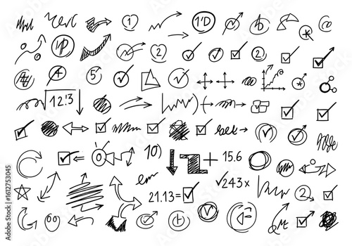 A collection of handdrawn sketch arrows, symbols, and icons for design elements