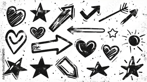 A collection of hand-sketched mark icons on a white background, featuring various symbols such as arrows, stars, hearts, and checkmarks, black and white, clean lines, minimalist