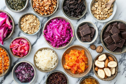 A collection of healthy foods in bowls, including nuts, seeds, grains, and vegetables.