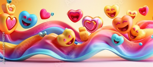 A collection of heart emojis amidst an abstract wave of bright colors and playful forms, conveying warmth.
