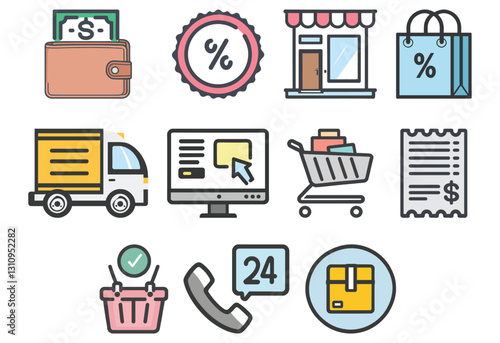 A collection of icons for shopping and shopping carts. The icons include a truck, a computer monitor, a shopping cart, a wallet, a phone, a box, and a bag