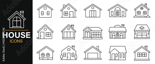A collection of icons representing different types of homes, including traditional and modern designs.