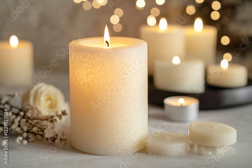 A collection of lit candles is beautifully arranged on a table