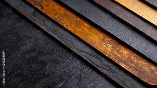 A collection of metallic strips in various colors and textures, arranged diagonally on a black surface.
