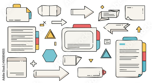 A collection of minimalist line art document icons, file tabs, arrows, and geometric shapes for digital organization and navigation.
