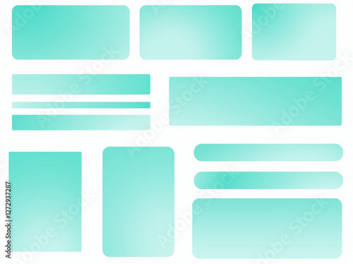 A collection of minimalist teal UI design elements, including various shapes and sizes of buttons, cards, and banners with a soft gradient effect.