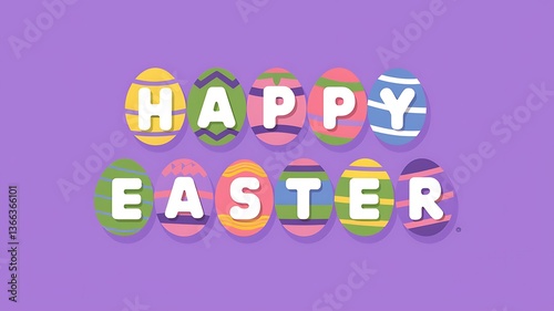 A collection of multicolored eggs spelling out the words 'Happy Easter' in vibrant colors with solid purple background and white letters, creating a festive and eye-catching Easter design festive vibe