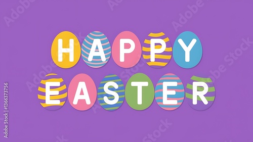 A collection of multicolored eggs spelling out the words 'Happy Easter' in vibrant colors with solid purple background and white letters, creating a festive and eye-catching Easter design festive vibe