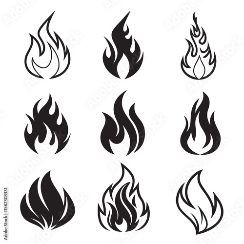 a collection of nine black vector fire icons with various flame shapes, simple silhouette style, plain white background