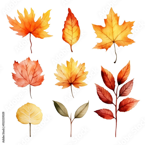 A collection of nine watercolor autumn leaves in various shapes and sizes, with shades of orange, yellow, and red, isolated on a transparent background.