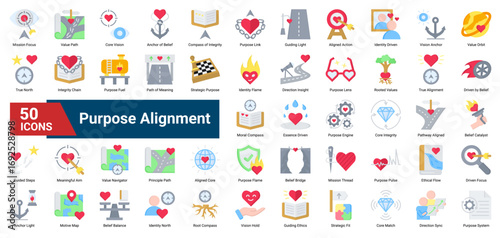 A collection of Purpose Alignment icons. Containing vision, values, belief, direction, integrity, identity, and core focus. Ideal for leadership, culture, and mission clarity.