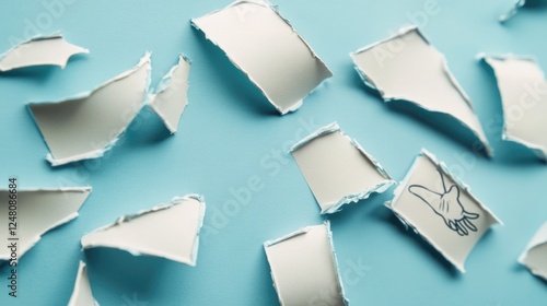 A collection of ripped papers scattered on a calm blue background
