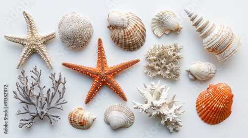 A collection of sea stars, shells, and coral displayed on a white background.