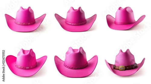 A collection of six pink cowboy hats on a white background, perfect for use in fashion, party or western-themed projects