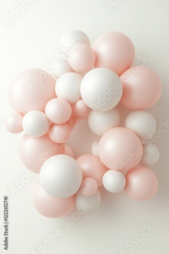 A collection of softly glowing 3D spheres in various pastel shades is gently arranged in a circular formation. The neutral backdrop provides ample space for creative text overlay