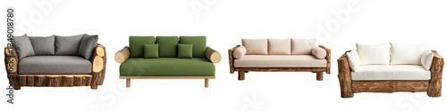 A collection of stylish and comfortable rustic wooden furniture including sofas couches and chairs with natural textures and designs