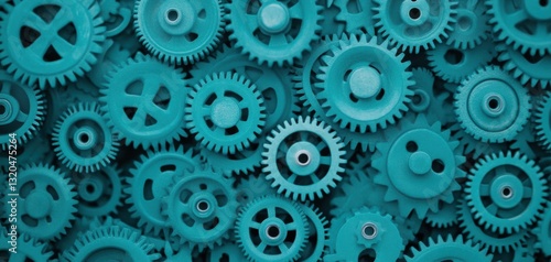 A collection of teal gears arranged closely together, showcasing details and textures. Ideal for concepts related to machinery, mechanics, or engineering.