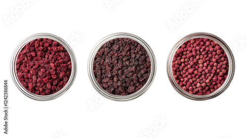 A collection of three jars filled with vibrant seeds, showcasing different shades of color and texture, perfect for culinary use.