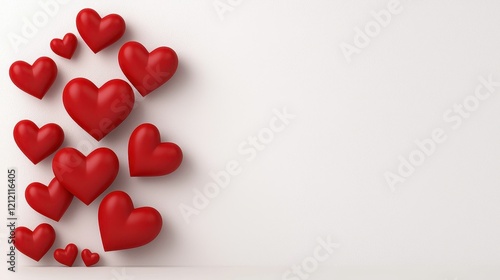 A Collection of Three-Dimensional Red Hearts Arranged on a Clean White Background for Romantic Themes, Valentine’s Day, and Love Expressions or Decorations