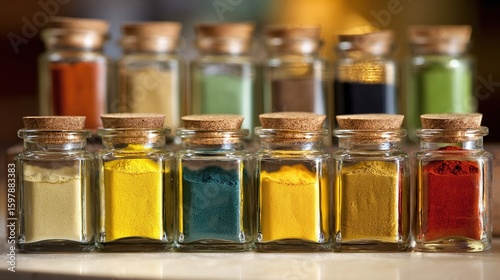 A collection of twelve small, clear glass jars with cork stoppers, each filled with a vibrant, different colored powder, sits on a light surface against a blurred background