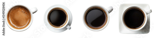 A collection of various coffee cups filled with different coffee beverages including espresso black coffee and a cappuccino with foam displayed on a table