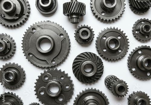 A collection of various metal gears and sprockets arranged on a plain white background surface