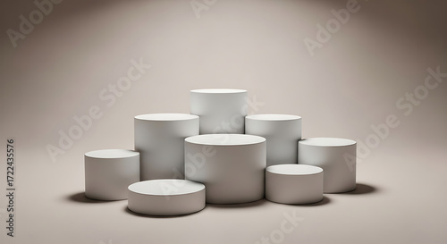 A collection of various sized white cylindrical podiums and platforms arranged in a cluster on a neutral beige background
