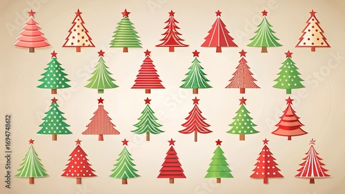A collection of various stylized christmas trees with different patterns and colors, set against a textured background