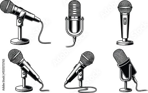 A collection of vintage microphone illustrations showcasing various styles and designs in black and white drawing