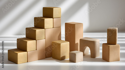 A collection of wooden blocks arranged, with a warm, neutral color palette and soft lighting. They're positioned to create different structures and shapes.