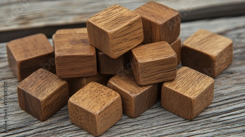 A collection of wooden cubes, showcasing rich textures and natural colors, arranged haphazardly on a rustic wooden surface.