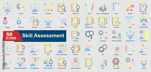A collection set of flat Skill Assessment icons. Includes proficiency, testing, evaluation, performance review, feedback, and more. Perfect for illustration and design.
