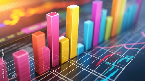 A colorful 3D bar graph rising upward, with financial data and growth indicators in the background.
