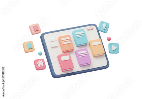 A colorful 3d render of a tablet displaying various ebooks, surrounded by pastelcolored app icons, isolated on transparent background