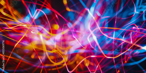 A colorful, abstract painting with bright red, blue, and yellow lines