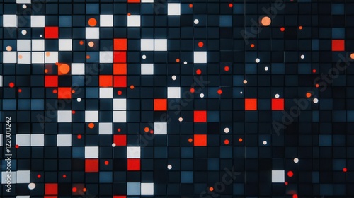 A colorful abstract pattern of squares and circles in red, white, and dark tones.