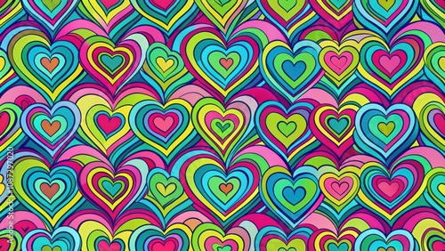 A colorful and psychedelic pattern of concentric hearts, featuring a mesmerizing interplay of vibrant hues, perfect for adding a playful and optimistic touch to any design.