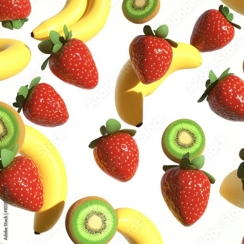 A colorful arrangement of bananas, strawberries, and kiwis on a white background.