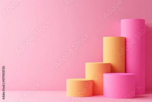 A colorful arrangement of cylindrical shapes in gradients of pink and orange on a pastel backdrop, symbolizing growth and progression.