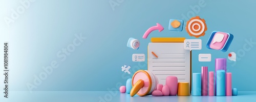 A colorful arrangement of playful stationery items and digital elements against a blue background, featuring a notepad, candy, and various creative icons.