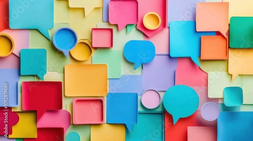 A colorful arrangement of speech bubbles and squares, symbolizing communication and ideas.