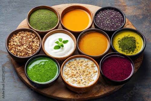 A colorful array of diverse sauces and dips in ceramic bowls.