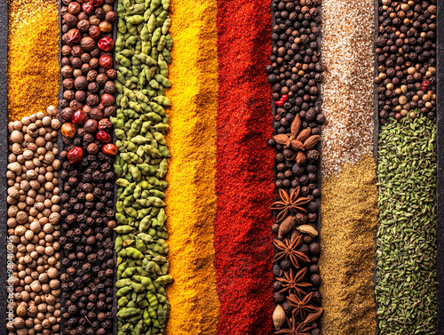 A colorful array of spices arranged in rows on the right side, with various grains and seeds scattered around them against a dark background.