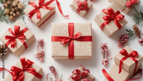 A colorful assortment of beautifully wrapped presents, adorned with shiny red ribbons and elegant bows, sits together, creating a festive and cheerful atmosphere perfect for celebrations.