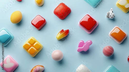 A colorful assortment of candies and sweets arranged on a light blue surface.