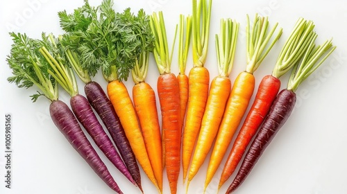 A colorful assortment of fresh carrots with green tops displayed on a white background.