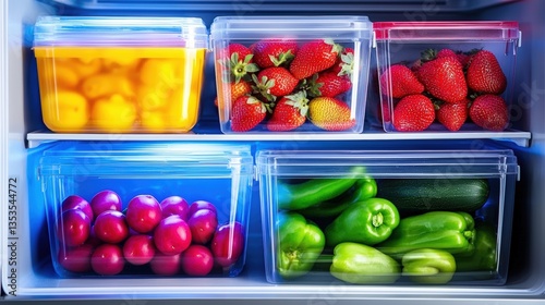 A colorful assortment of fresh fruits and vegetables neatly organized in transparent containers inside a refrigerator, Vegan Meal Prep .