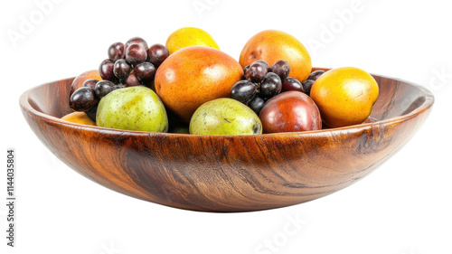 A colorful assortment of fresh fruits arranged in a wooden bowl on a white background, suitable for healthy eating promotion.