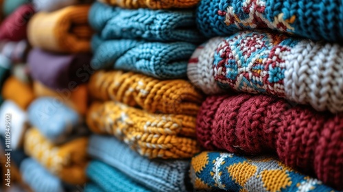 A colorful assortment of neatly folded knitted sweaters, showcasing various textures and patterns in warm hues.