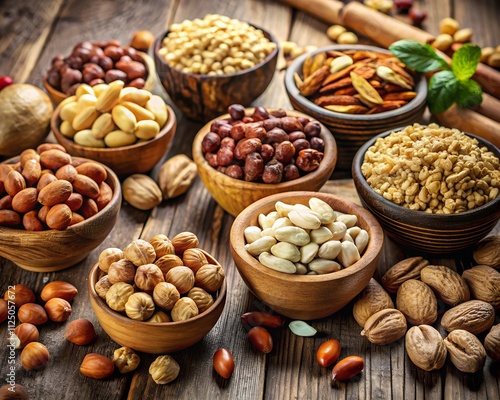 A colorful assortment of nuts and seeds fills wooden bowls, showcasing an inviting arrangement on a warm, rustic table. Perfect for healthy snacking or cooking